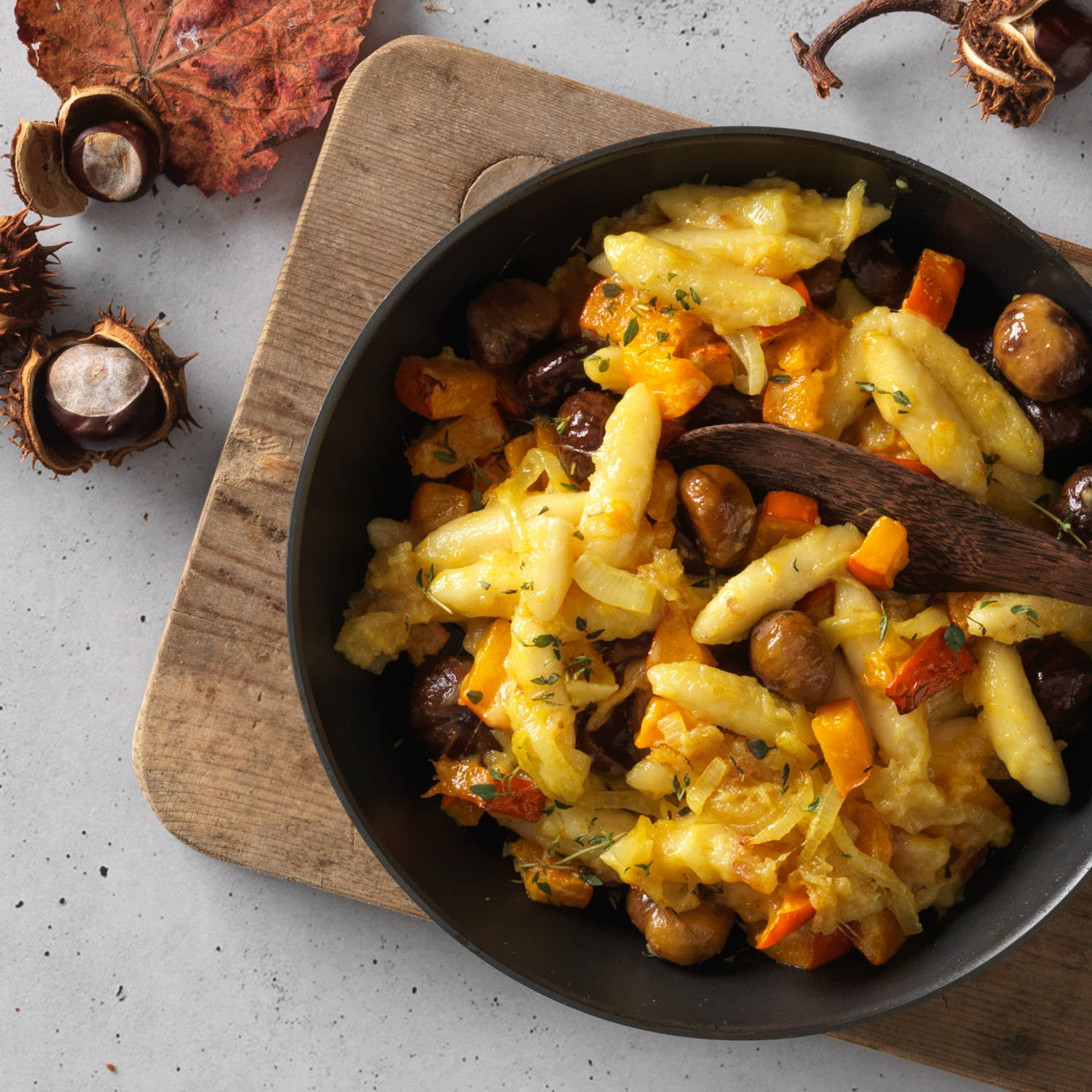 Poêlée de nouilles aux pommes de terre avec du potiron et des châtaignes