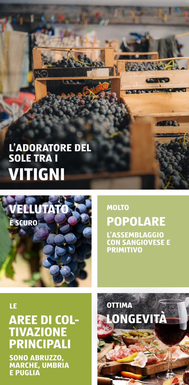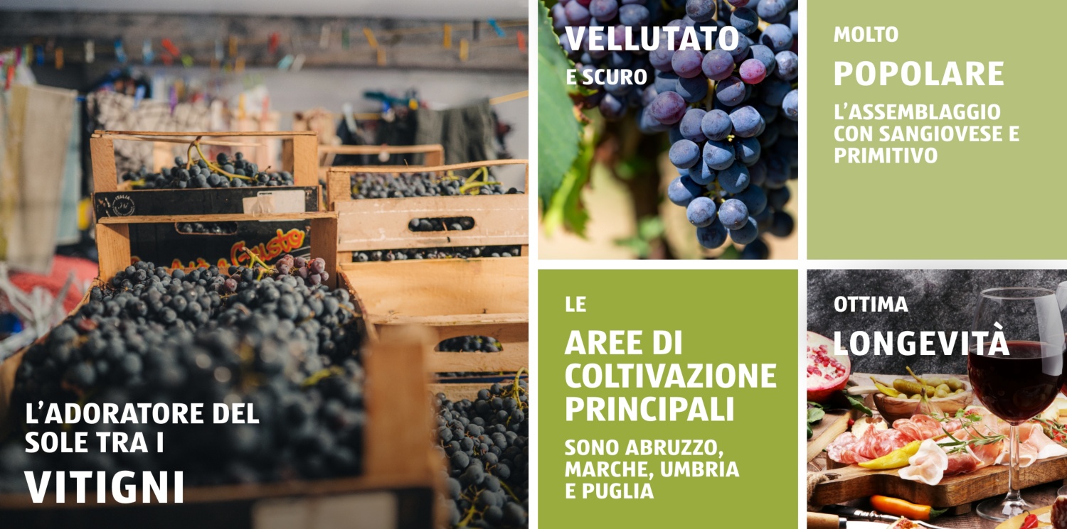 I vini del vitigno rosso Montepulciano sono molto scuri e hanno un colore intenso. La lunga esposizione al sole e la vendemmia tardiva permettono di produrre vini rossi corposi e a bassa acidità. I vini Montepulciano, ricchi di estratti, hanno un’ottima conservazione e stupiscono anche con il passare degli anni.