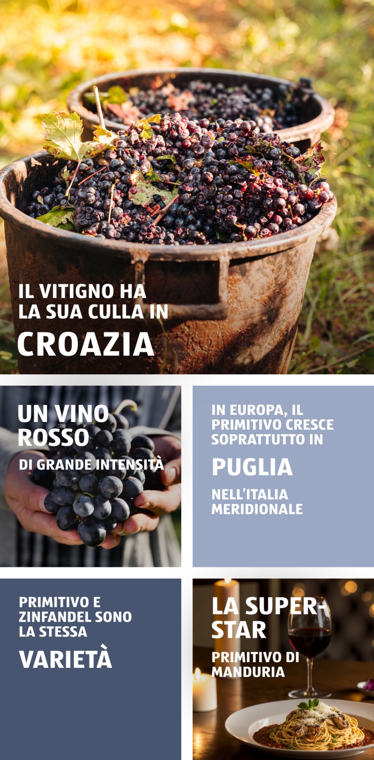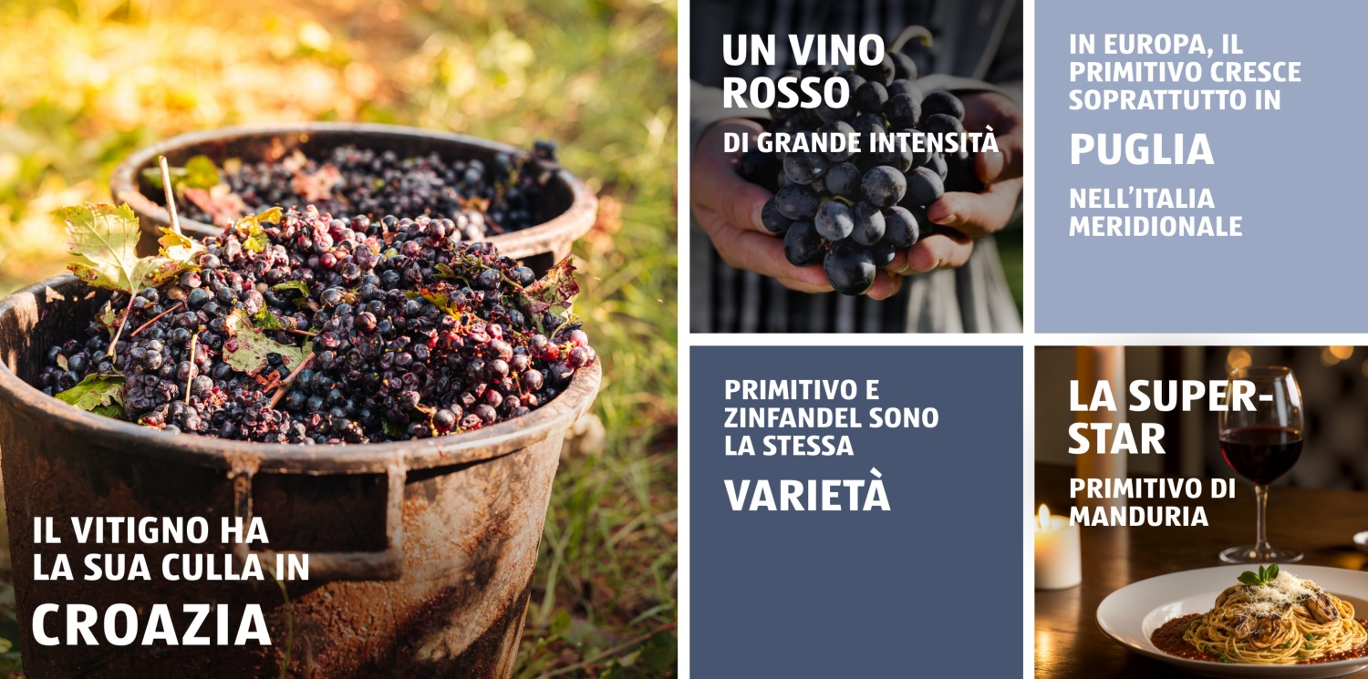 Ormai non si può più mettere in discussione il fatto che la patria moderna del vitigno Primitivo sia l’Italia sud-orientale e più precisamente la Puglia. Ma gli storici del vino sostengono che questa varietà affondi le sue radici nei vigneti costieri della Croazia. Lì viene coltivato ancora con il nome di Crljenak Kaštelanski o Tribidrag. Non è ancora noto come l’uva si sia spostata dalla costa croata a quella italiana.
