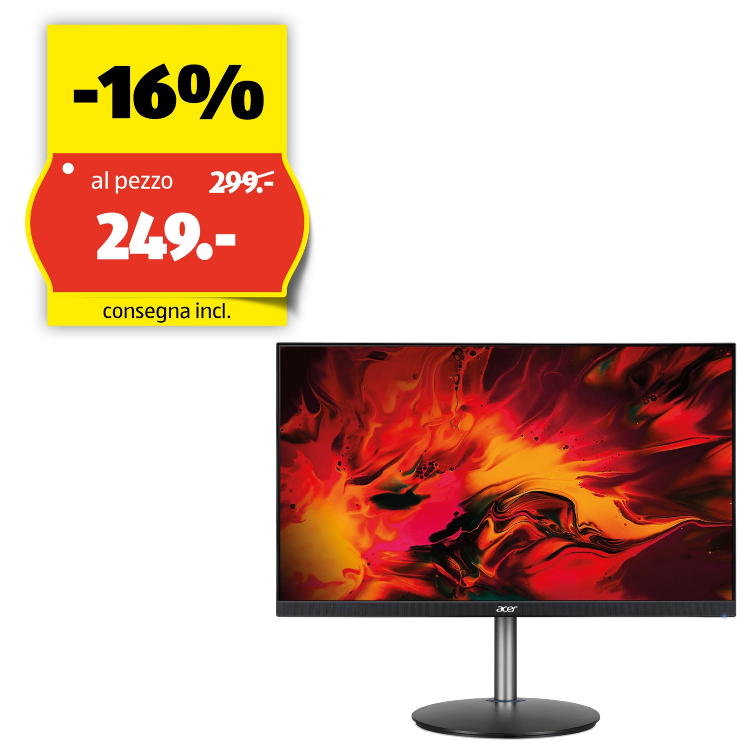 Pannello IPS ad alta fedeltà cromatica (16,7 milioni di colori, 99% sRGB), luminosità di 400 cd/m², frequenza di aggiornamento di 240 Hz (overclockabile fino a 280 Hz), tempo di risposta di 1 ms (0,5 ms in modalità Fast), compatibile con l’anti-tearing "FreeSync"