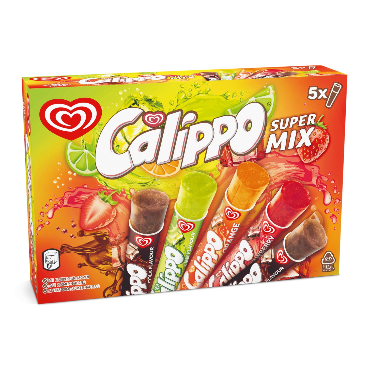Il CALIPPO Super Mix riunisce diversi gusti rinfrescanti in una confezione – ideale per le calde giornate estive e come varietà alla frutta. Fragola, arancia o cola: Questo ghiacciolo convince per il suo aroma intenso e il formato Calippo tanto apprezzato comodo da spremere.Perfetto per i bambini, le famiglie o tutti coloro che non sanno quale gusto scegliere - il CALIPPO Super Mix assicura il massimo divertimento del gelato in vari colori. Highlights