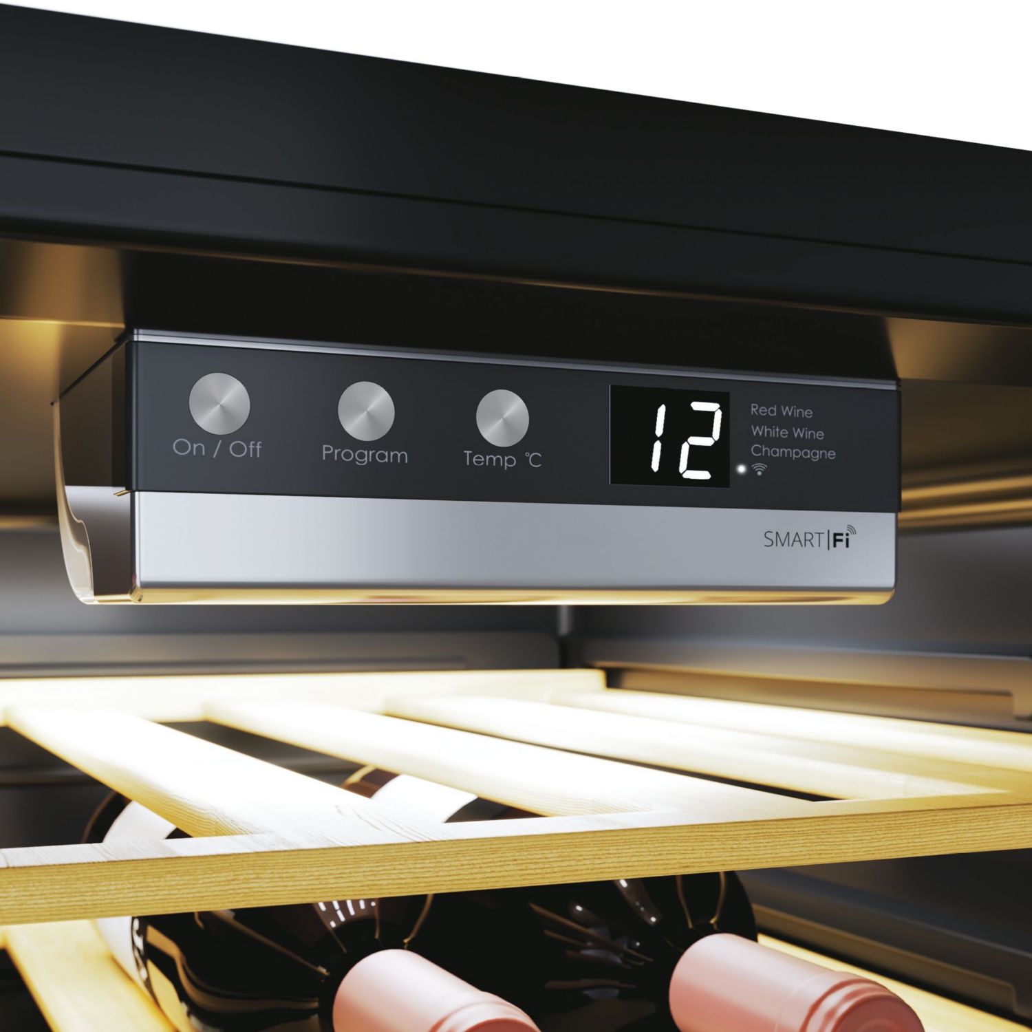Con il pannello di controllo elettronico avrai il controllo facile e intuitivo della tua cantinetta DiVino. Accendi o spegni la cantinetta con un tocco, scegli i programmi specifici con le temperature adatte per vini bianchi, vini rossi e spumanti oppure per conservare una combinazione di diversi tipi di vini. Se desideri puoi anche impostare la temperatura a mano tra 7 e 18 gradi.