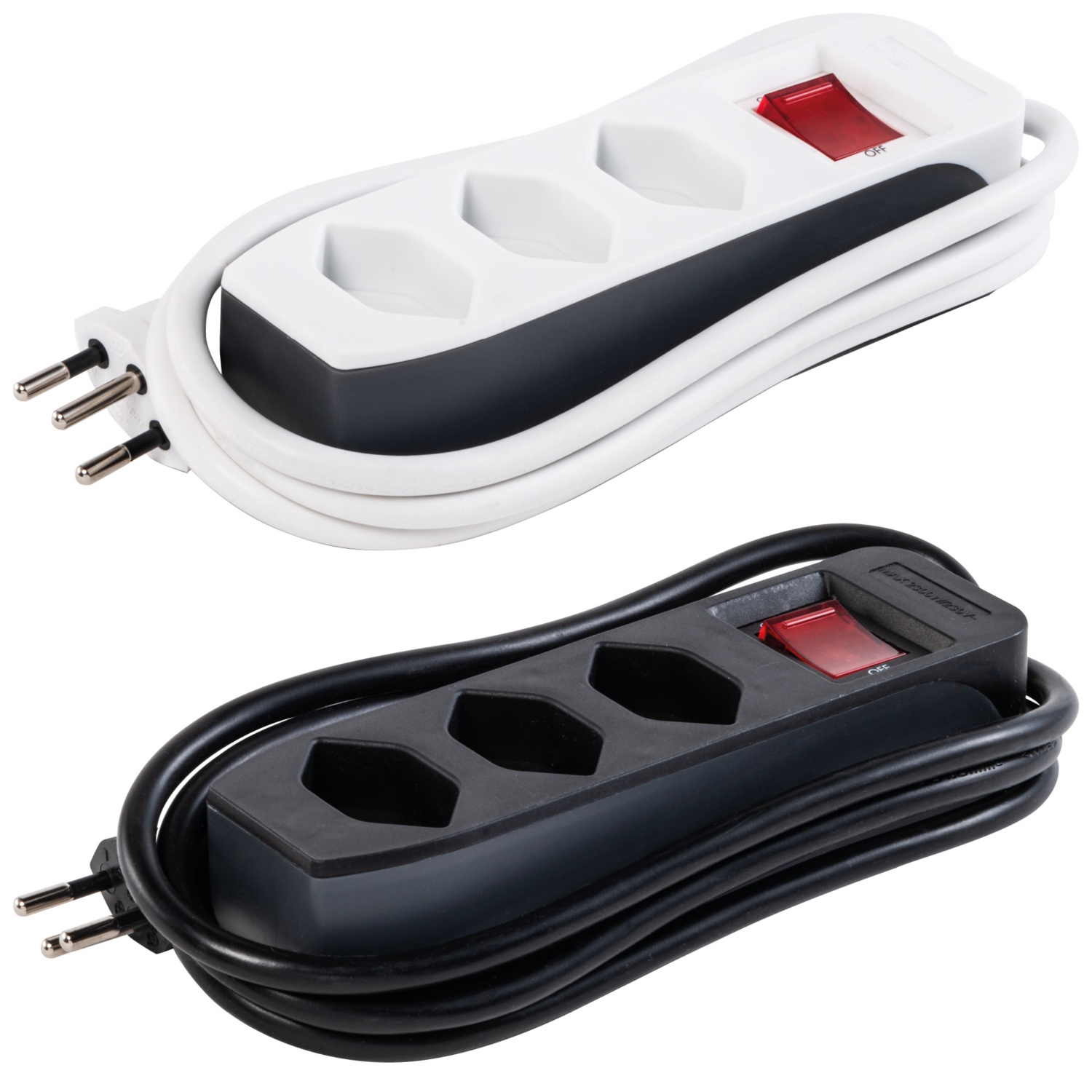 Cavo di prolunga a 3 prese con interruttore on/off illuminato, con protezione personale aumentata contro le scosse elettriche, per uso interno, con spina svizzera; nero/grigio e bianco/grigio assortiti, 230 V, 10 A, 2300 Watt;S+