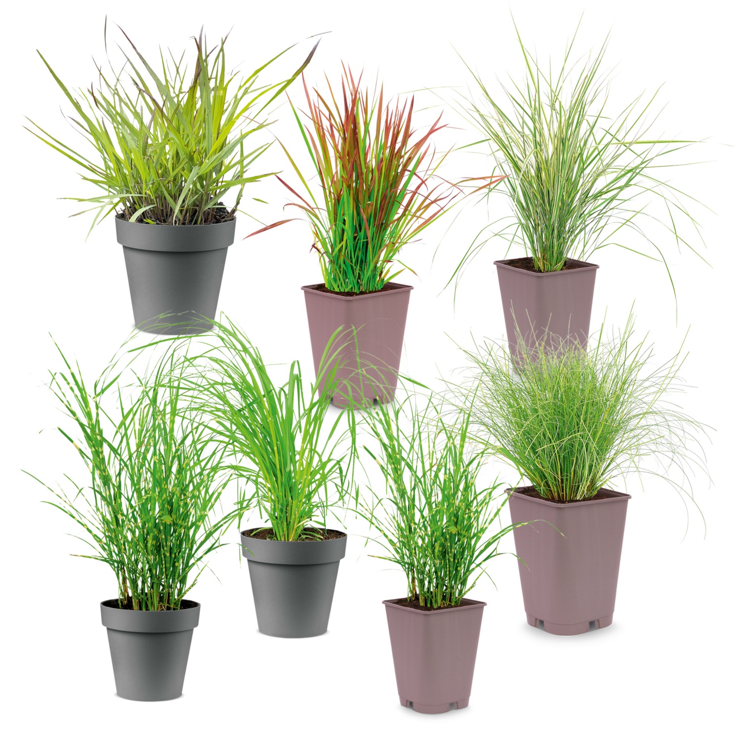 In vaso da 3 litri, altezza incl. vaso ca. 40 - 100 cm (alla varietà), in diverse varietà come Imperata cylindrica, erba della pampa o Miscanthus sinensis, ecc. Pittogrammi: [[Resistente alle basse temperature]]