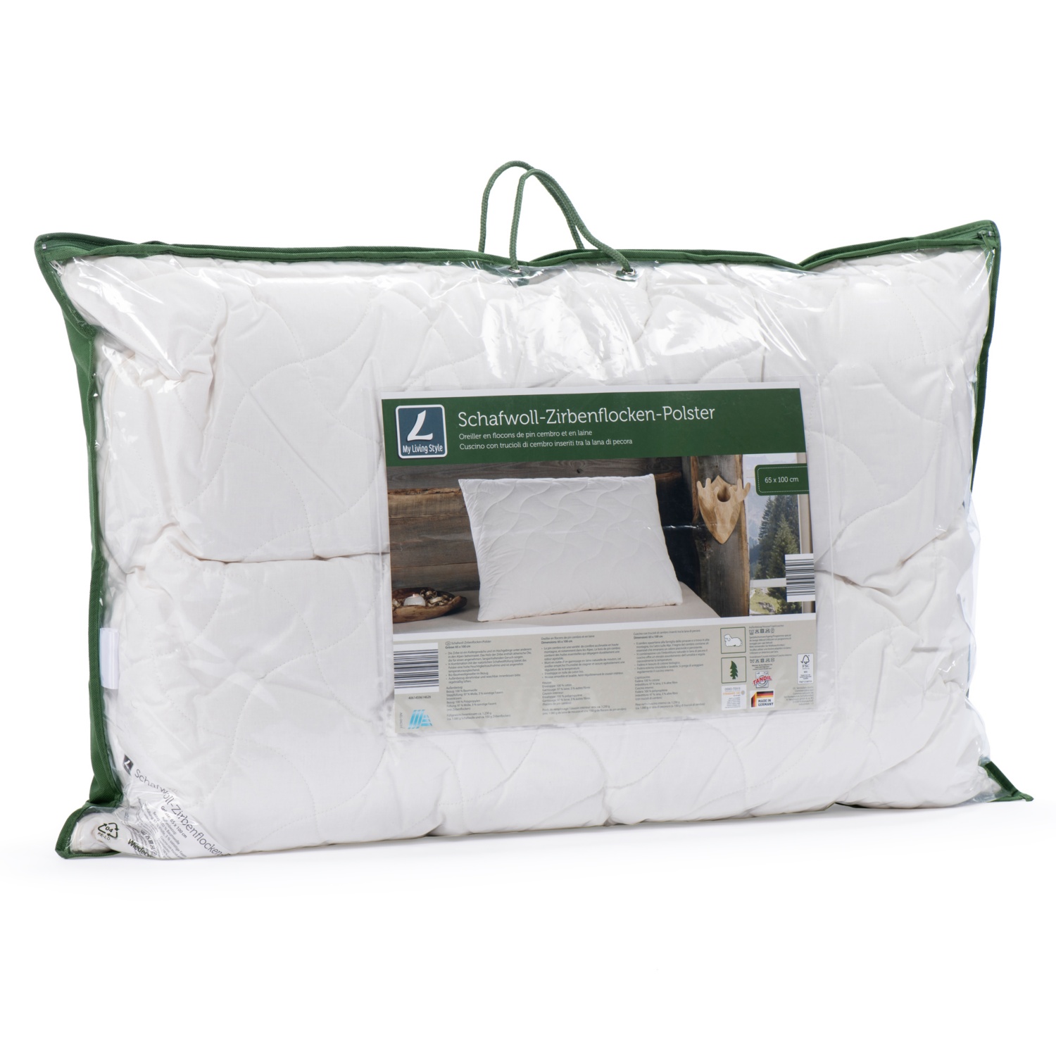 - imbottitura: ca. 1.050 g di lana di pecora e ca. 150 g di trucioli di cembro