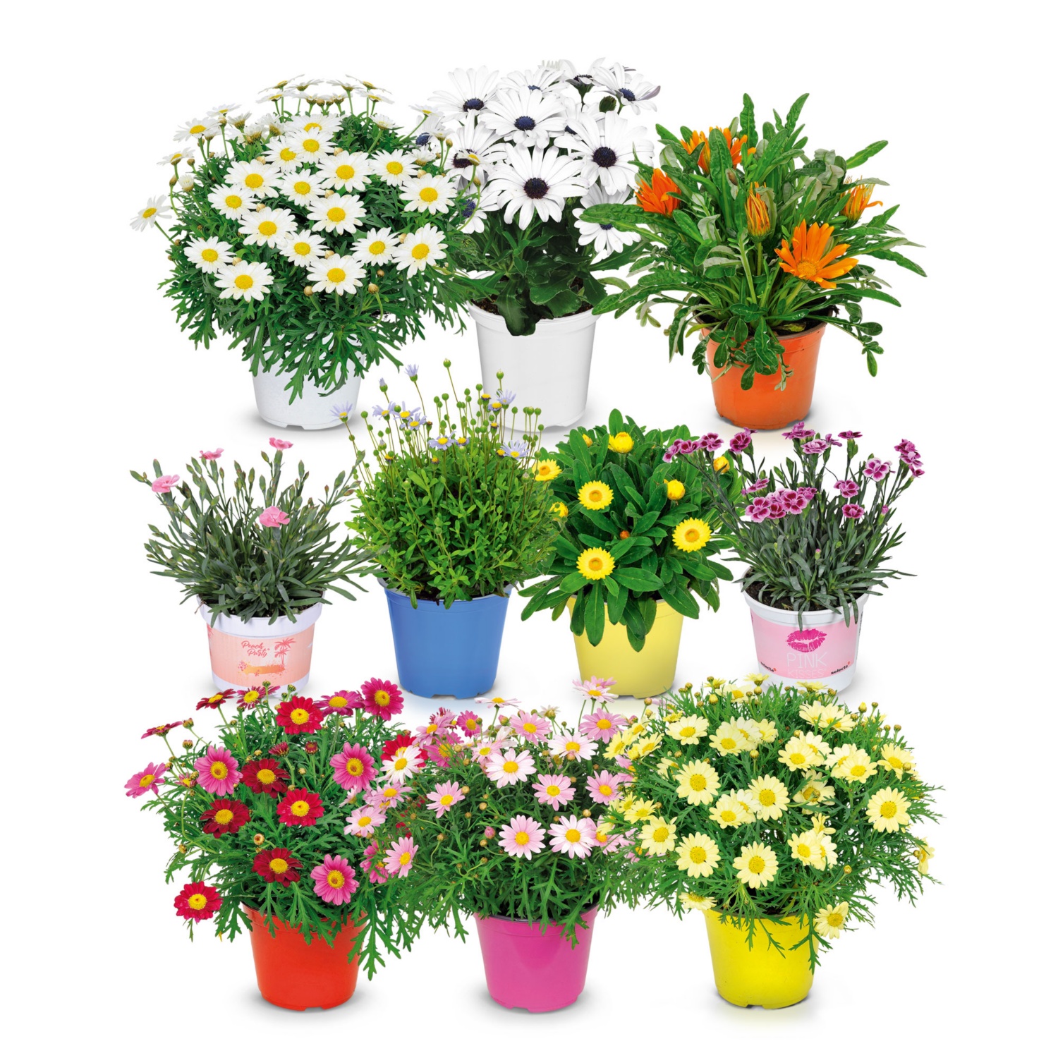 in vaso da 14 cm, altezza incl. vaso: 20-35 cm (in base alla varietà), diverse varietà come gazania, margherita, garofano, elicriso, margherita blu ecc., ideali per piantare in aiuole o in vaso