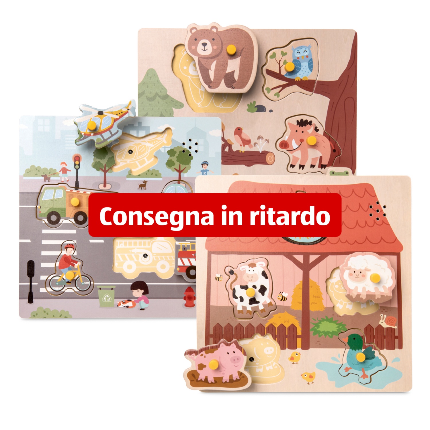 quando si inseriscono i pezzi, si sente il suono corrispondente al soggetto: una bicicletta, un orso selvatico o una dolce anatra. Disponibile in 3 divertenti varianti di design: