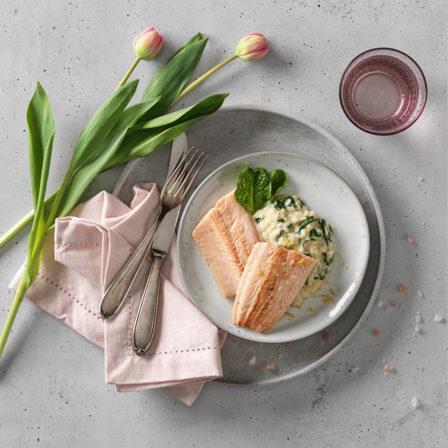 - Servire il risotto su un piatto, aggiungere i filetti di pesce e irrorare con il burro al limone.