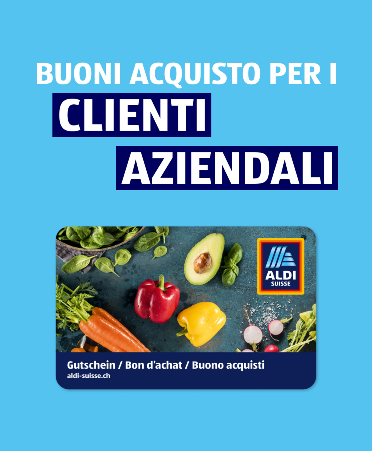 «Di più per la vita» non è solo il nostro motto. Regalate ai vostri clienti o collaboratori un buono acquisto di ALDI SUISSE. I nostri buoni sono davvero versatili e riscuotono sempre molto successo! Permettono a chi li riceve di scegliere liberamente tra i prodotti di qualità del nostro assortimento e a voi di risparmiare tempo prezioso nella ricerca del regalo giusto. I nostri buoni acquisto offrono semplicemente di più: per voi, per i vostri clienti, per i vostri collaboratori e naturalmente per la vita!